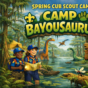 Camp Bayousaurus is a dinosaur-themed Cub Scout adventure set deep in the bayou at Mt. Bayou Scout Camp, where Scouts explore the outdoors through